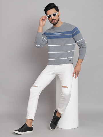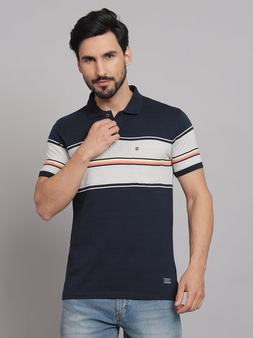 Embrace your unique personality with this comfortable but not ordinary navy blue casual striper t-shirt....