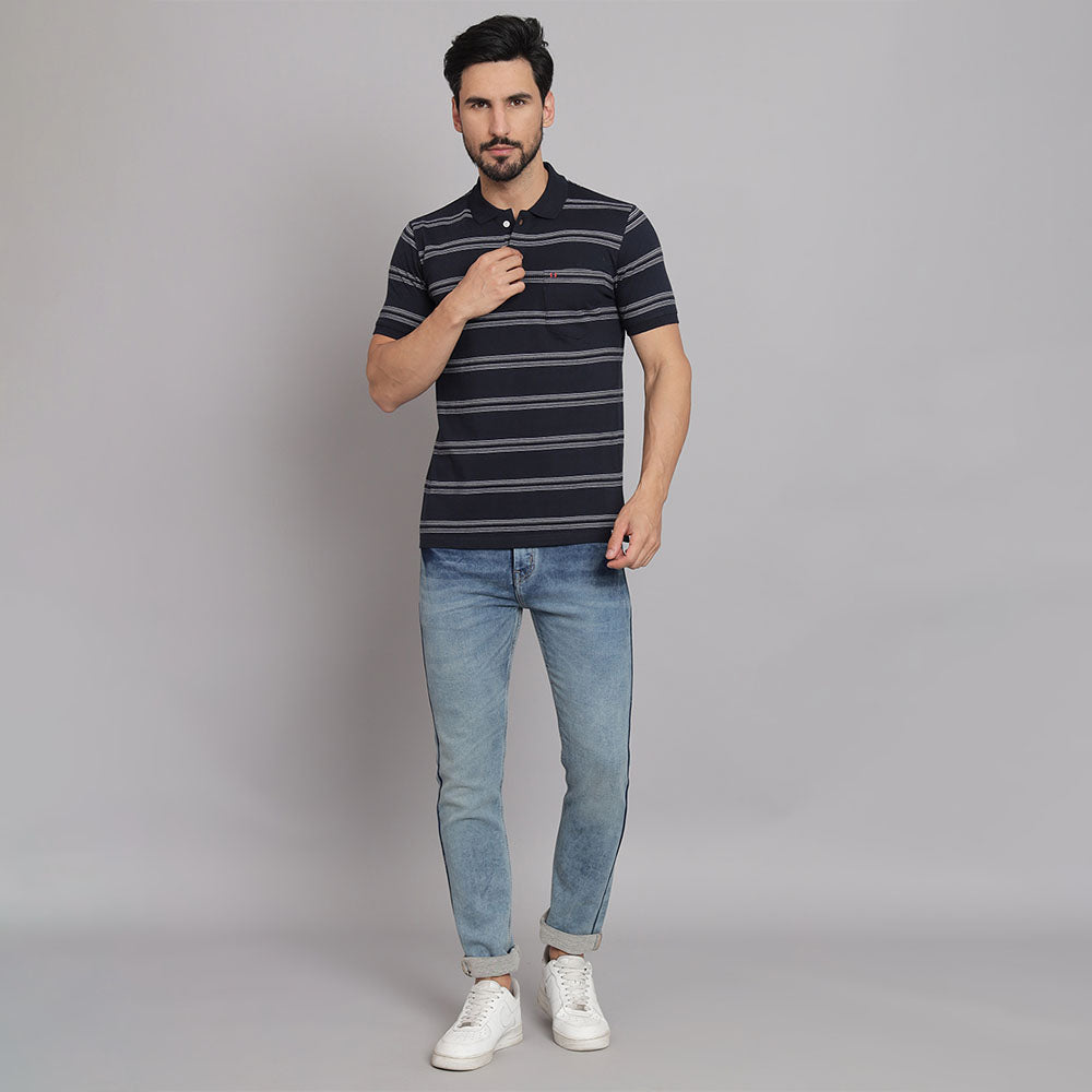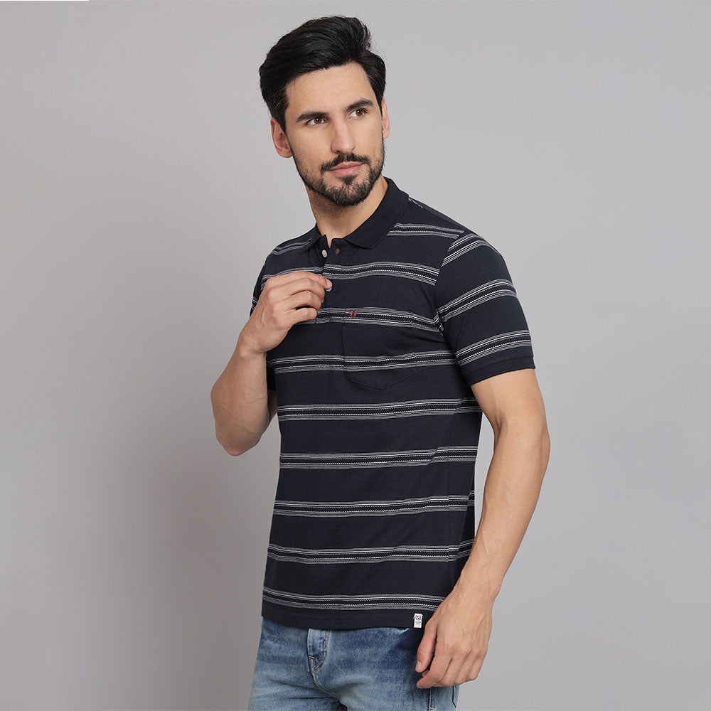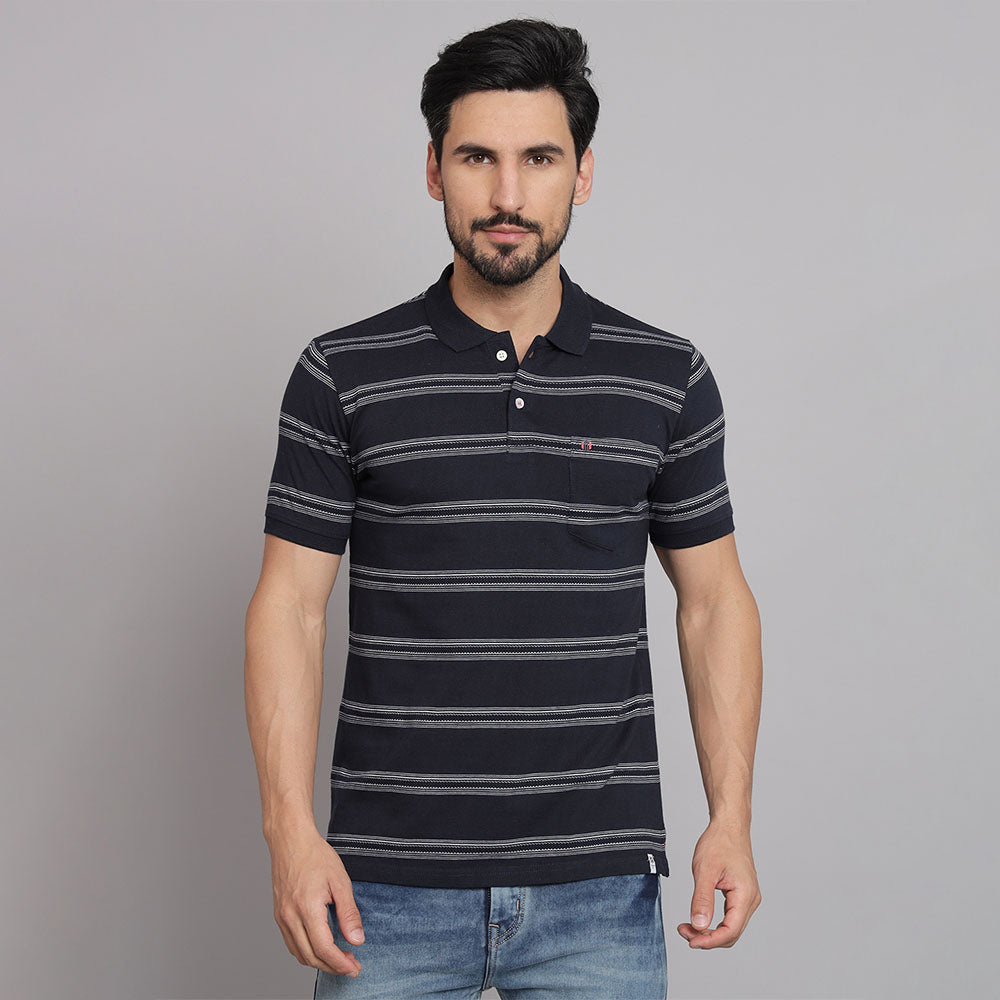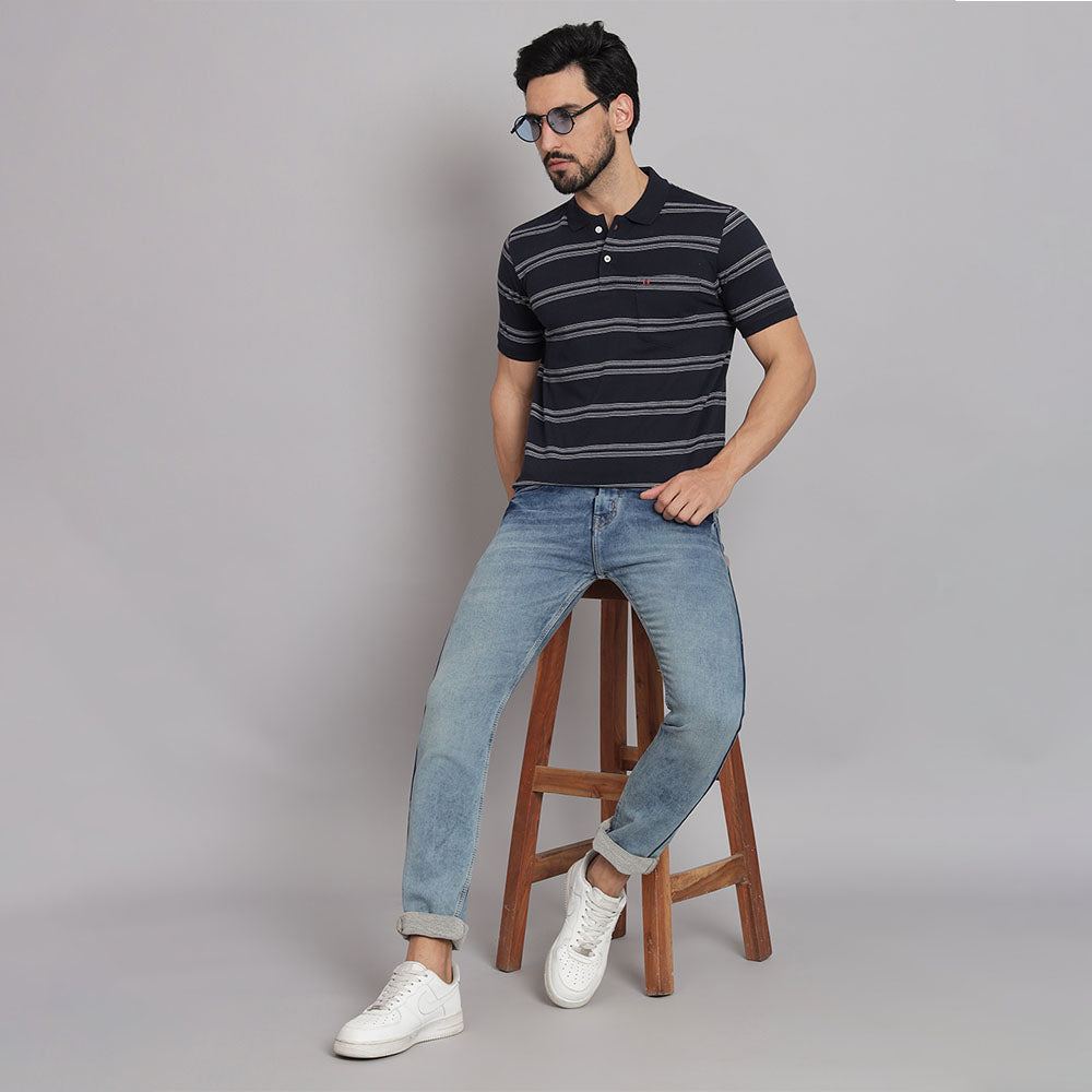 Uplevel your fashion game and add a touch of swagger to it with this Black And White striped Casual T-shirt. Club this with acid-washed jeans and casual shoes for a smart look.