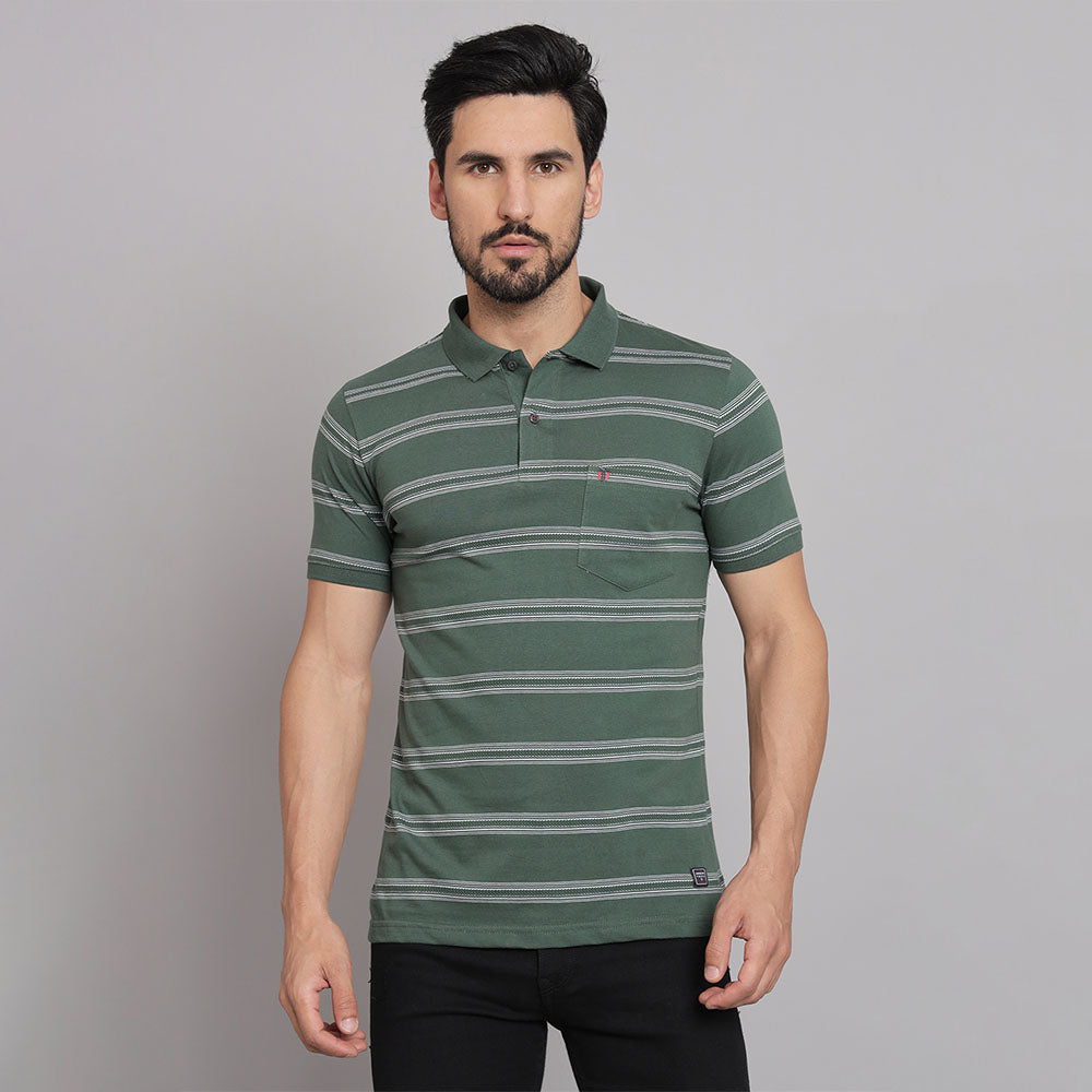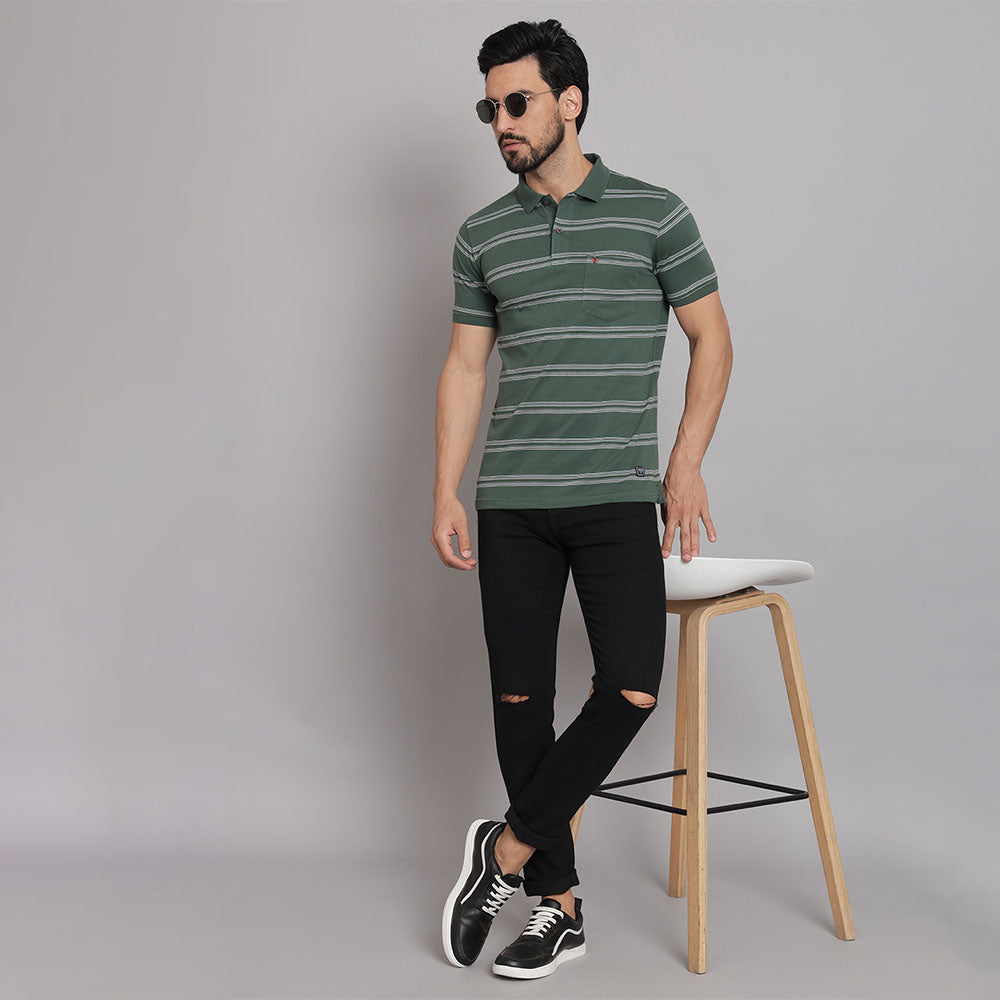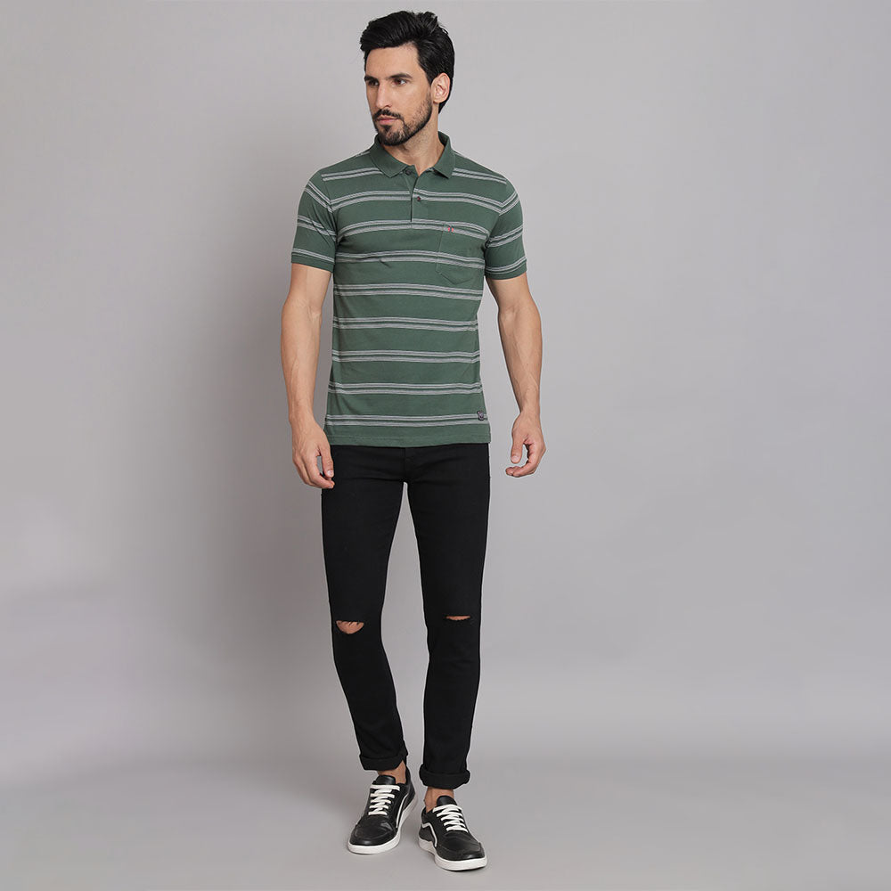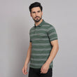 Add fun to your daily wear with this Hunter green Stripers Casual T-shirt. This T-shirt features a collared neckline and half-sleeves, crafted with a cotton blend fabric. Style this t-shirt with a pair of jeans and sliders for a stylish cool look.