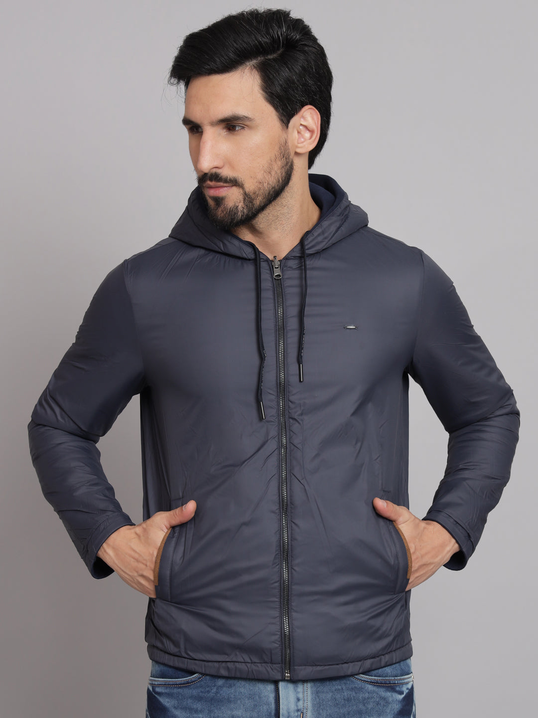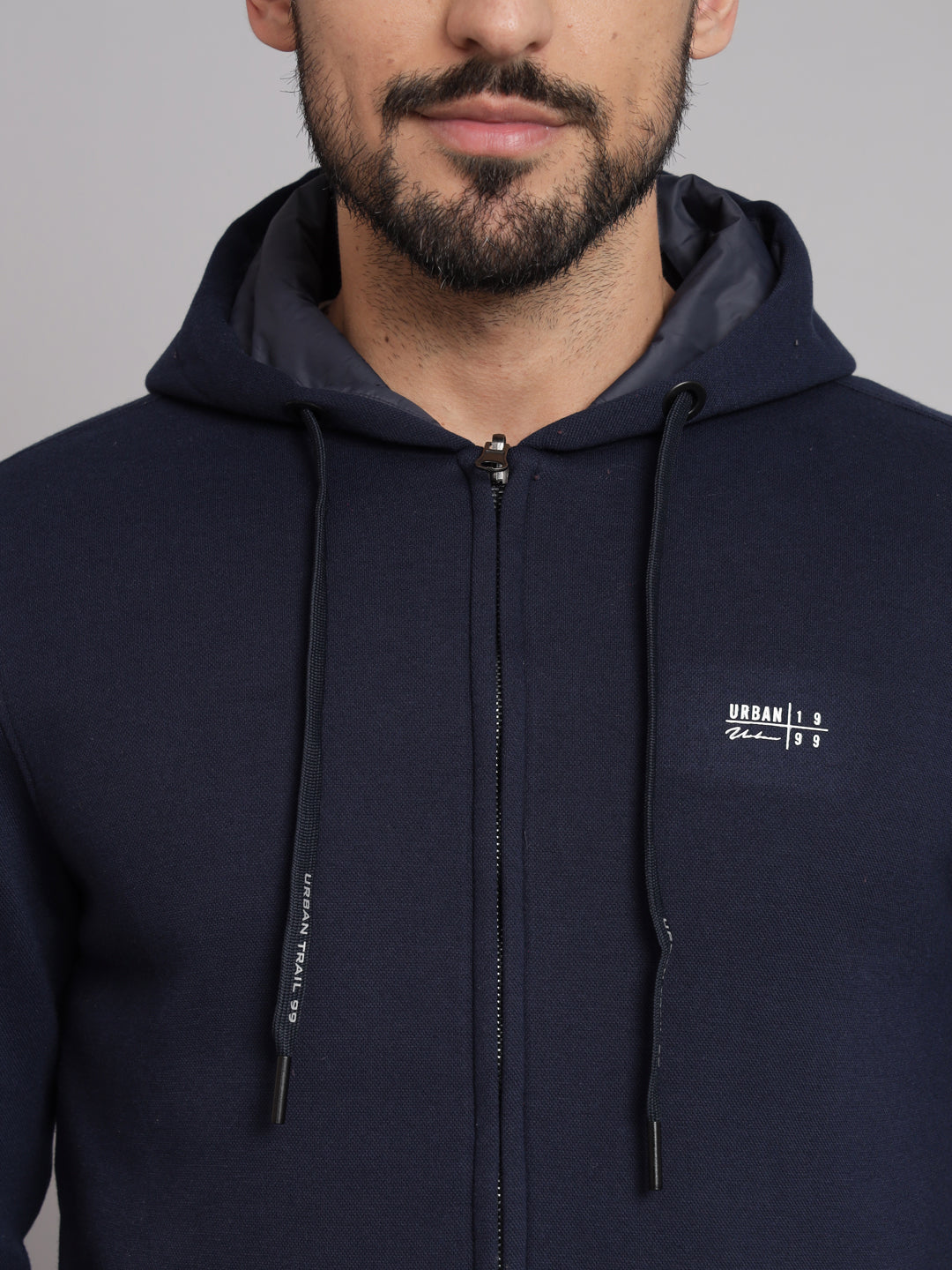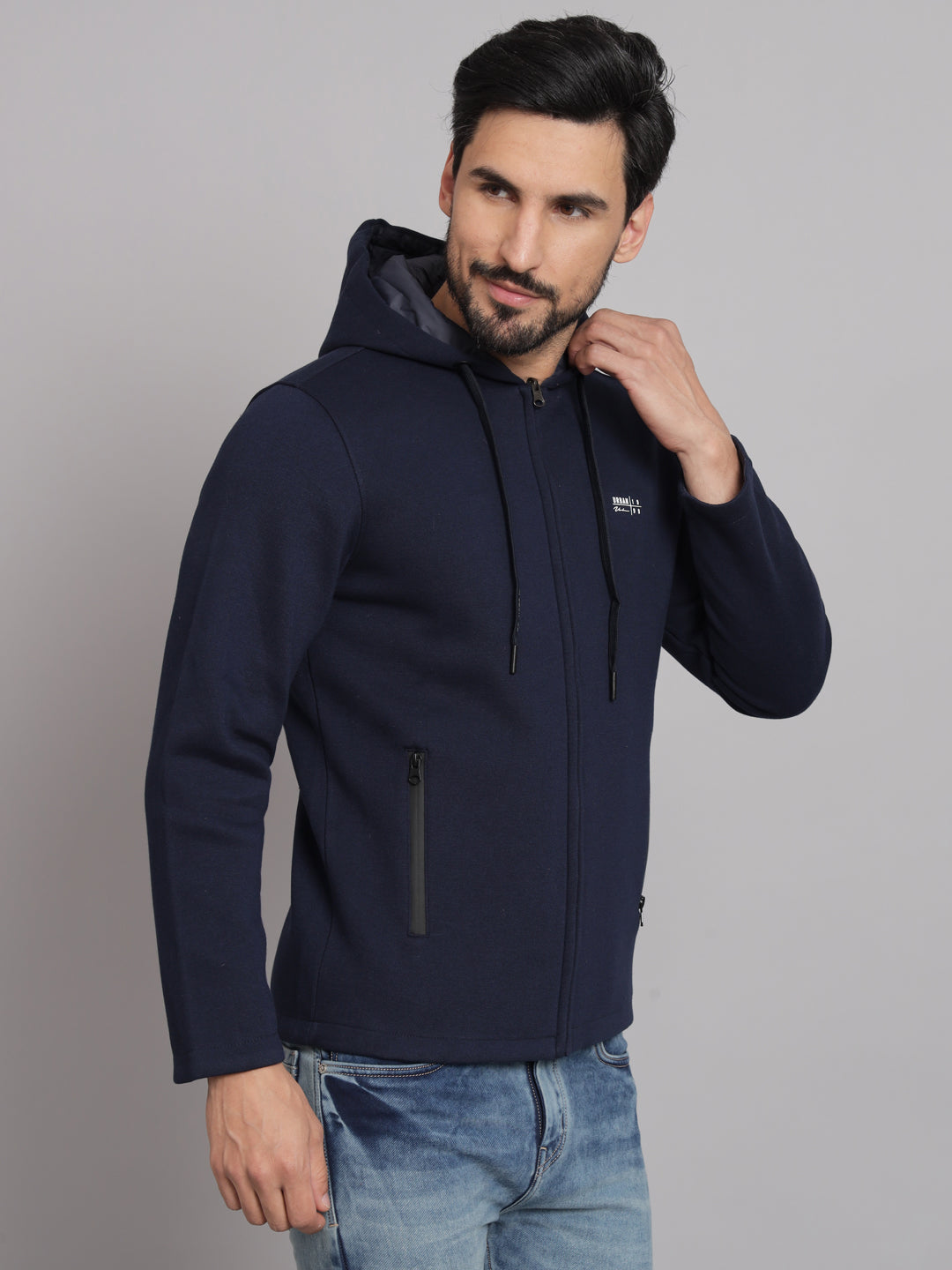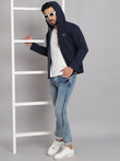 Upgrade your casual attire with this Navy Blue Jacket, complete with a hood, full sleeves, and a cotton blend for maximum comfort. Ideal for layering, it's a versatile addition to your wardrobe.