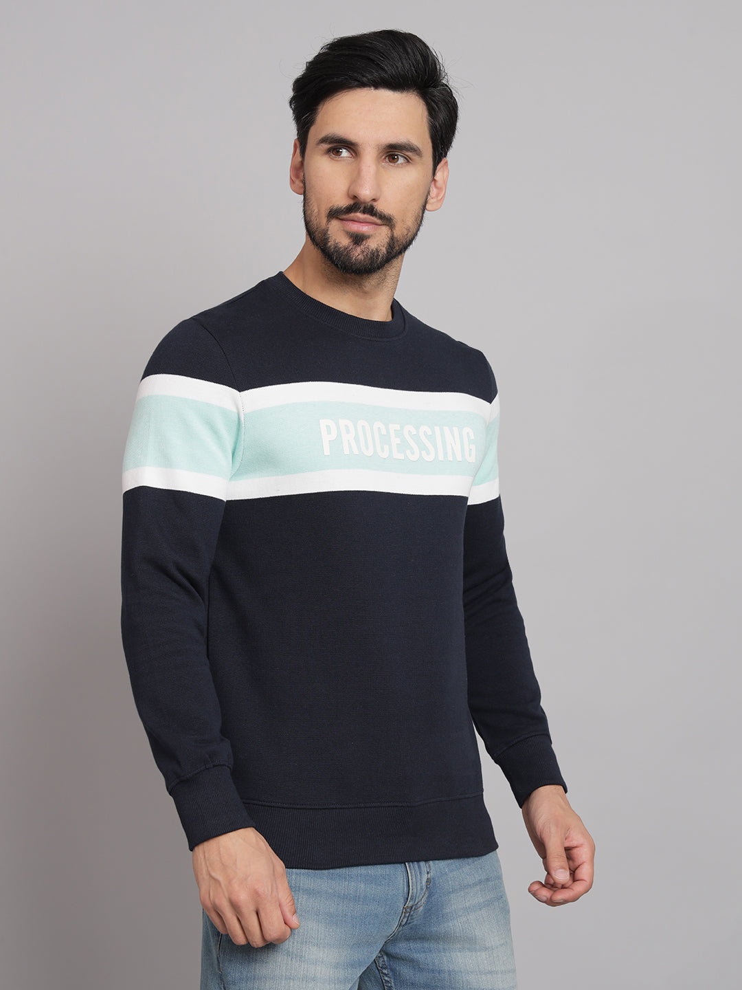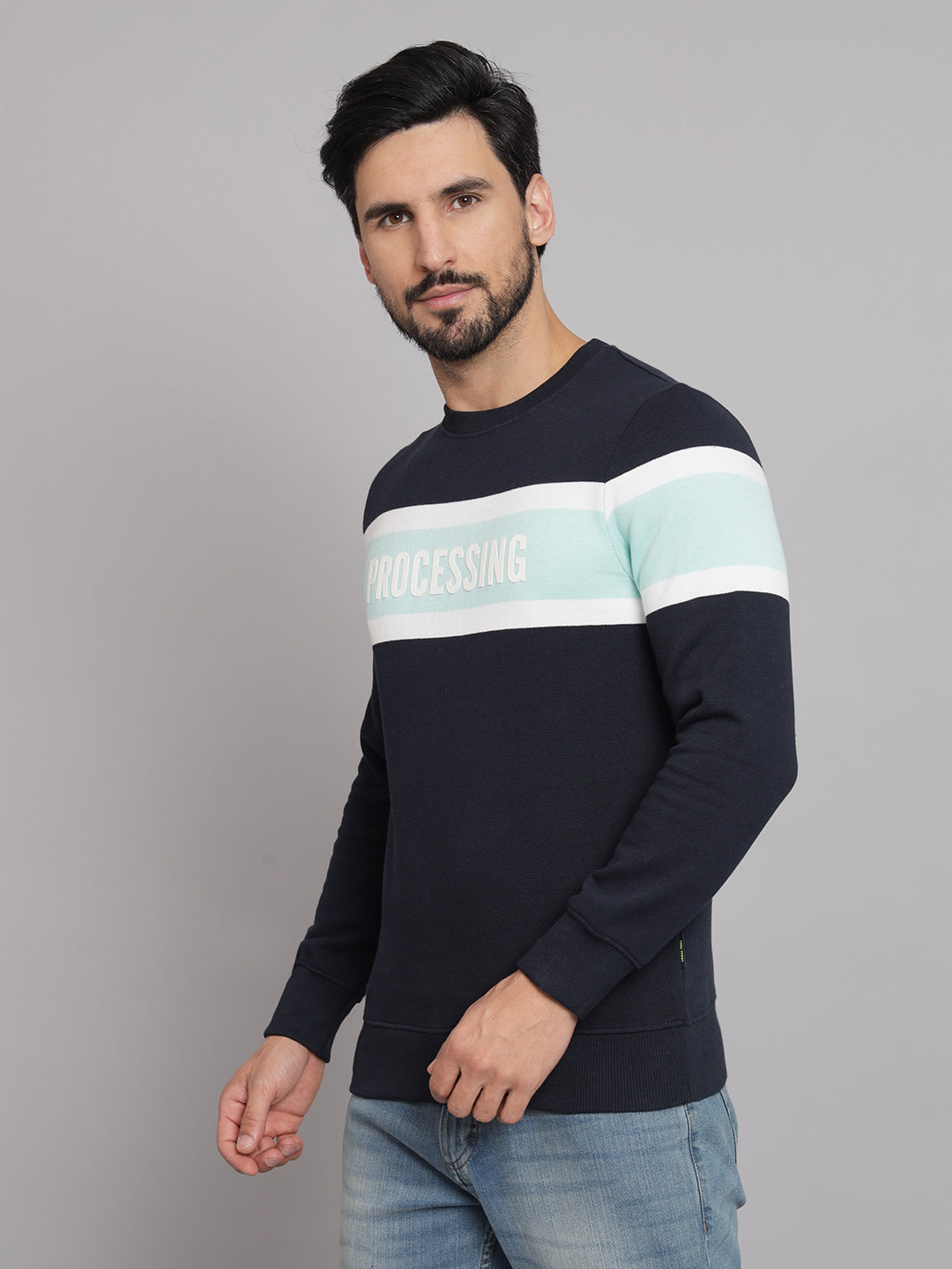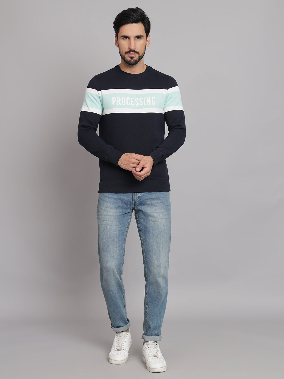Make a statement in this Navy Blue round-neck sweatshirt that exudes casual elegance. Featuring a round neck and full sleeves, it's carefully crafted from a cotton blend that strikes the perfect balance between warmth and breathability. Elevate your wardrobe with this versatile piece that can be dressed up or down to suit any occasion.
