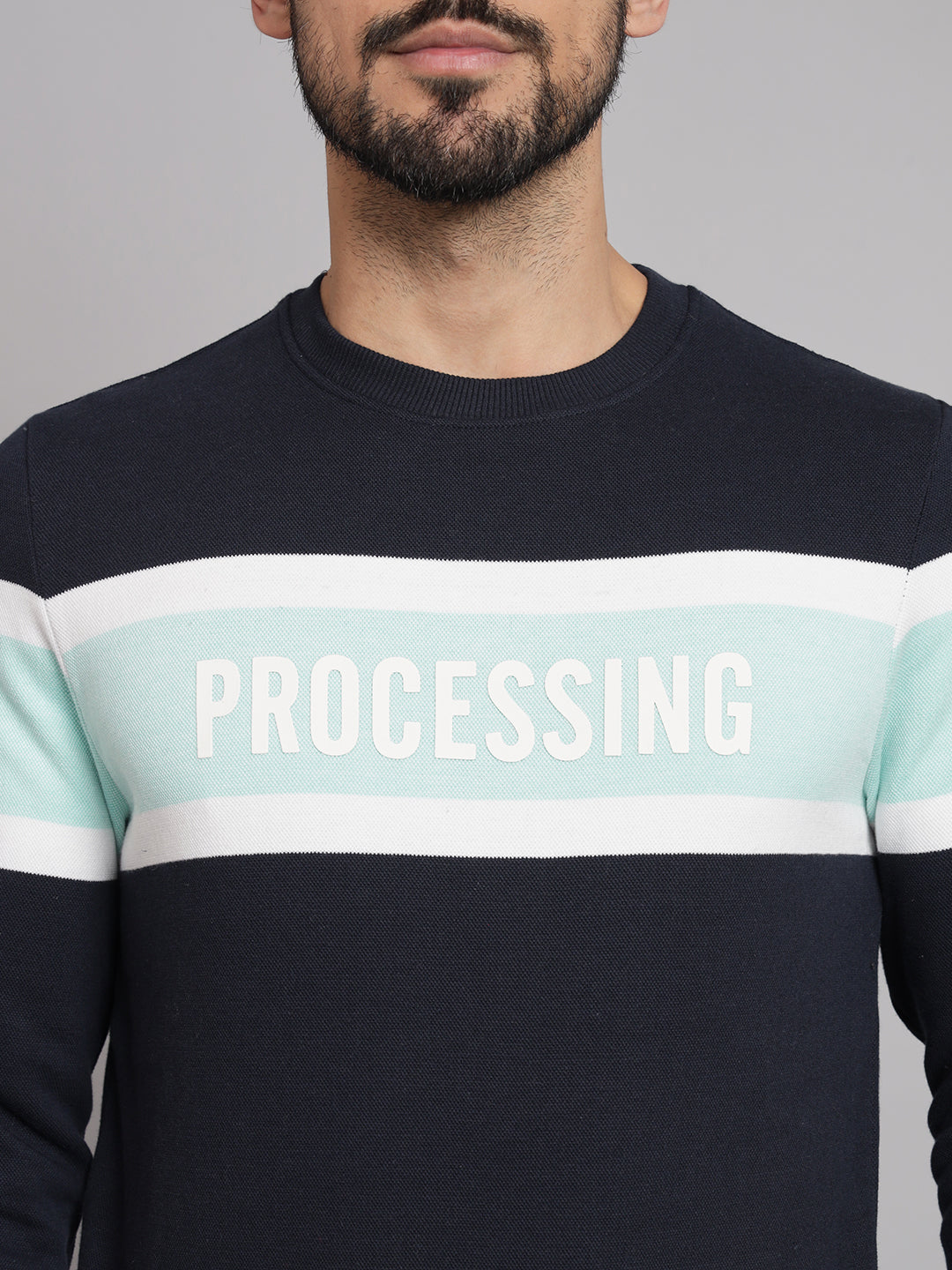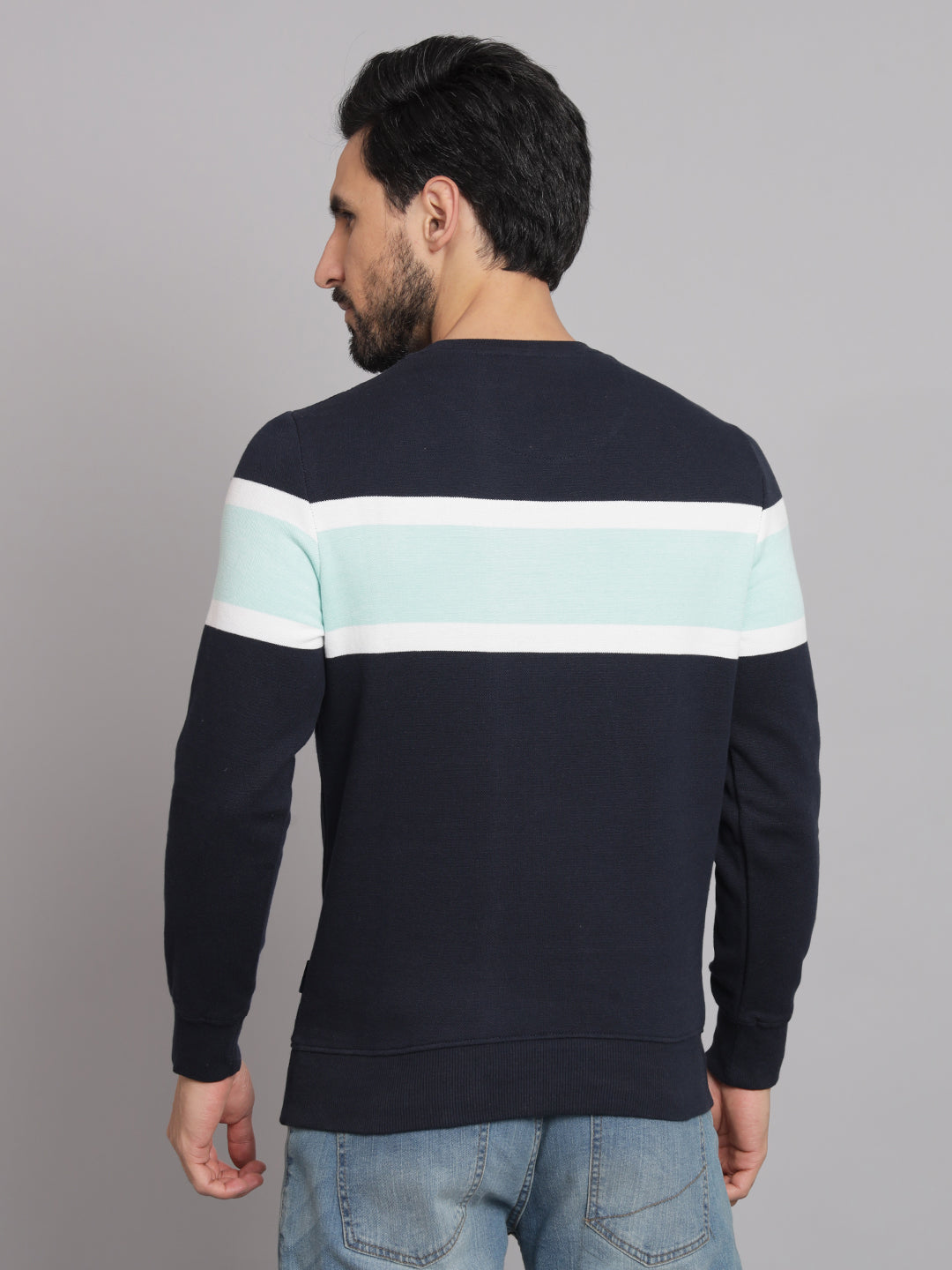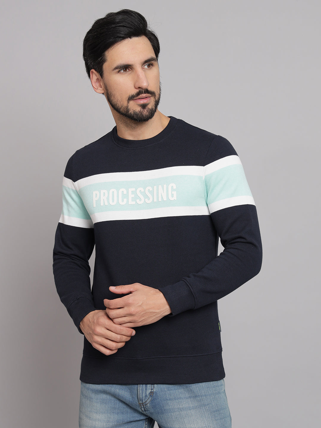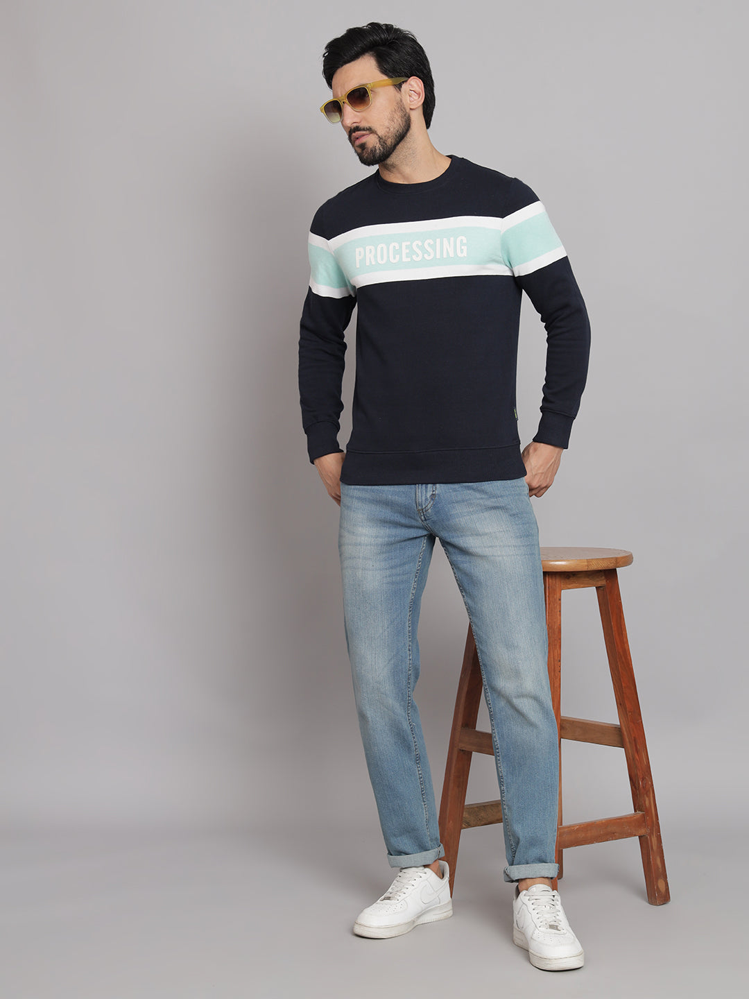 Make a statement in this Navy Blue round-neck sweatshirt that exudes casual elegance. Featuring a round neck and full sleeves, it's carefully crafted from a cotton blend that strikes the perfect balance between warmth and breathability. Elevate your wardrobe with this versatile piece that can be dressed up or down to suit any occasion.