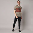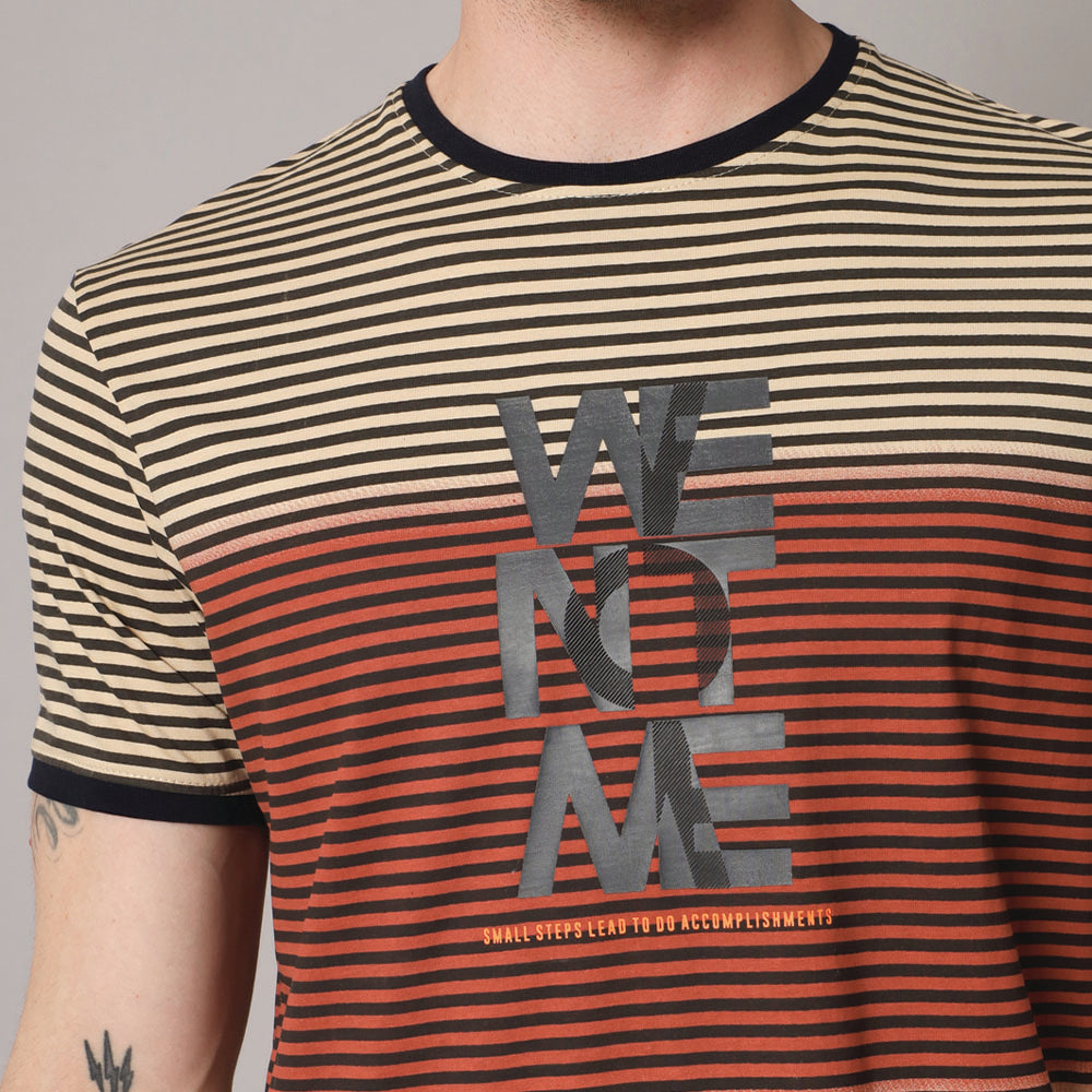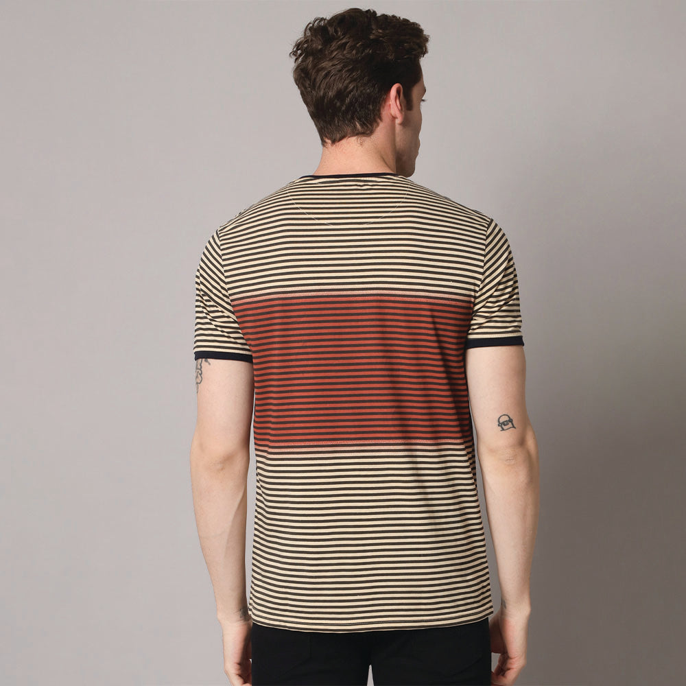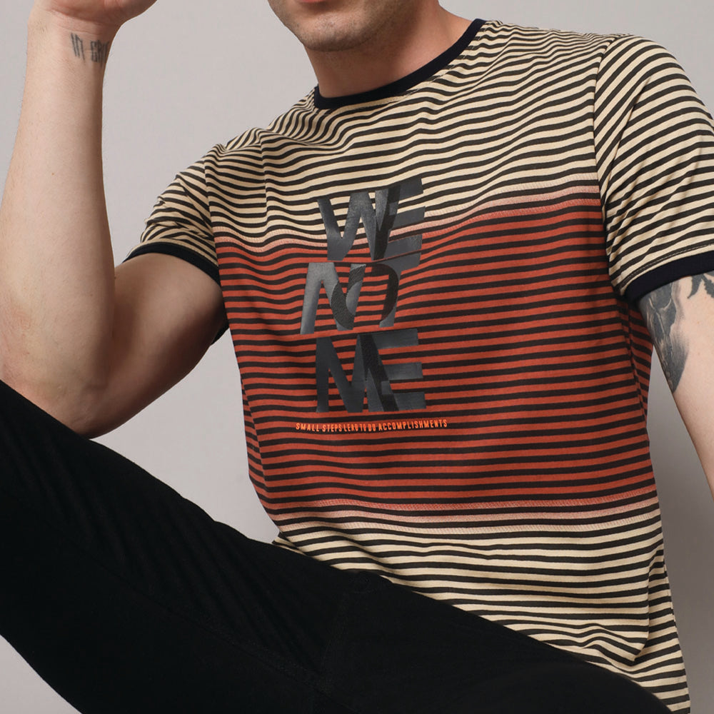 Update your casual T-shirt collection from our store with this Ochre Mustard Striped Round Neck T-shirt. It will keep your fashion game on point. Wear it with jet-black jeans and White shoes for a complete casual look.