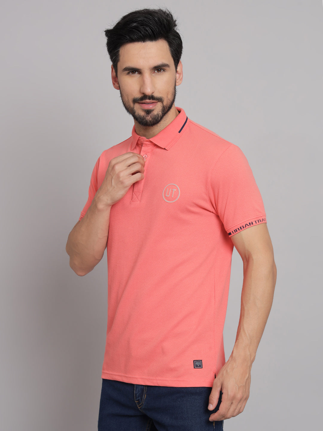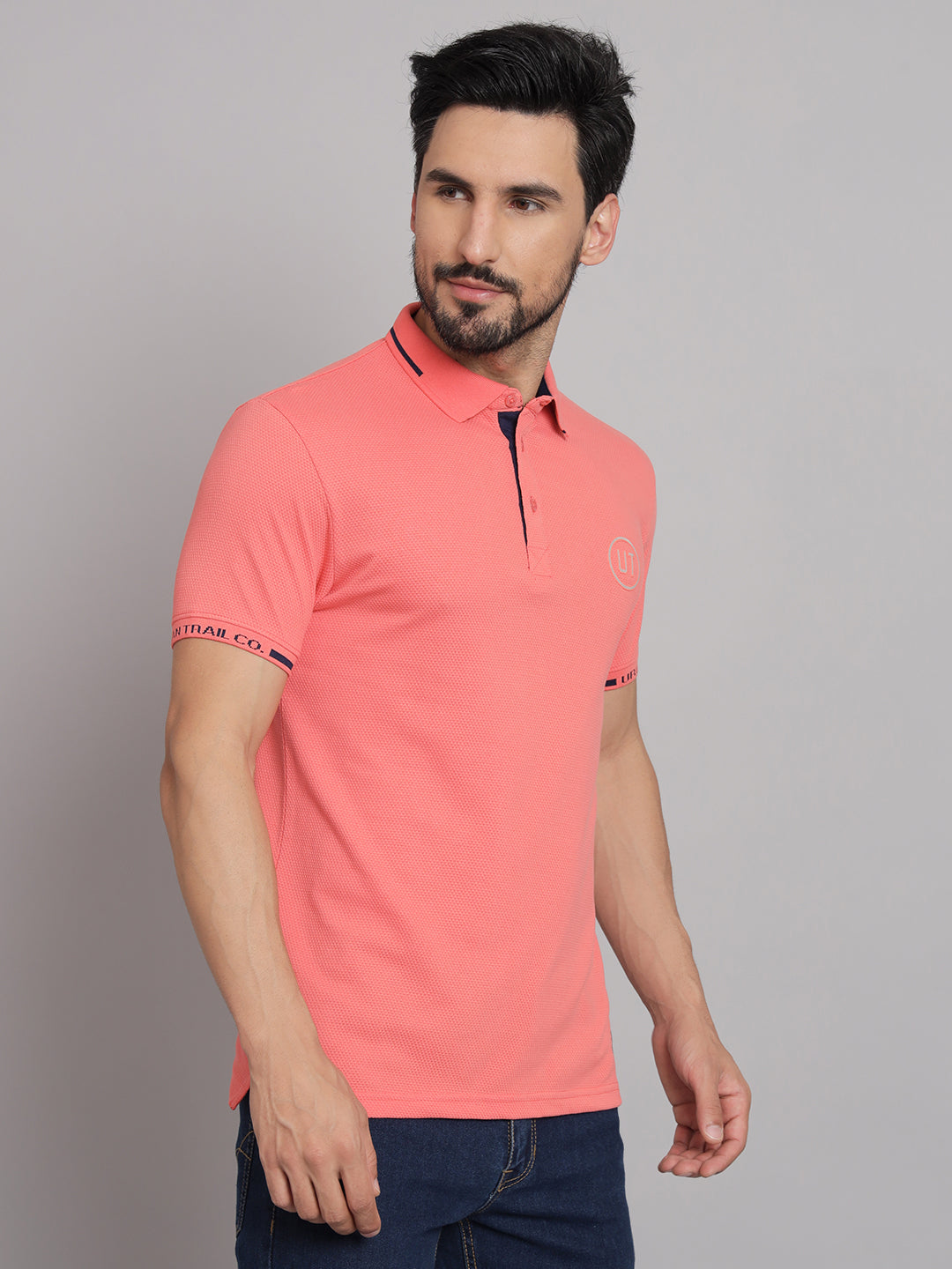 Feel freshness Wearing this joyfulPeach Polo T-shirt. This features half-sleeves and straight fitting. Wear it with Formal straight-fitting pants for your casual meeting look.