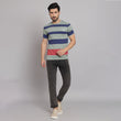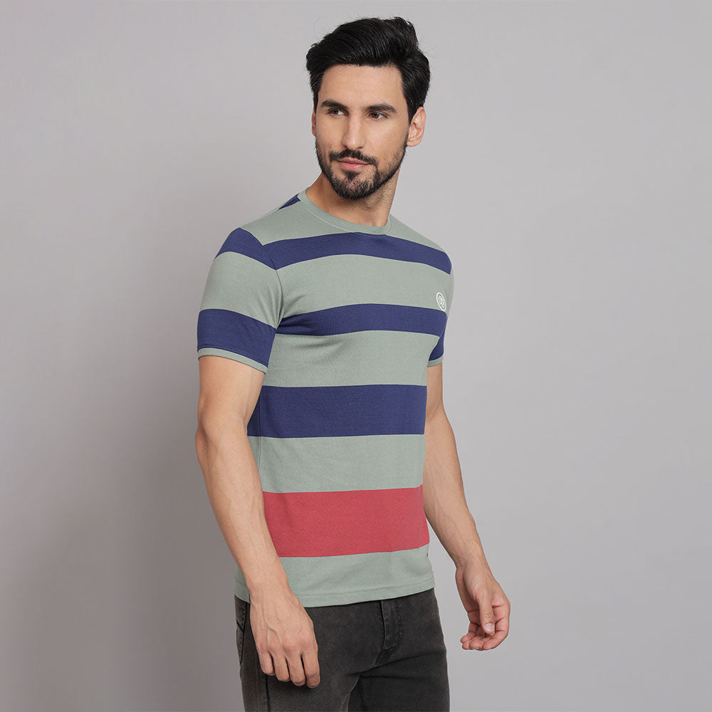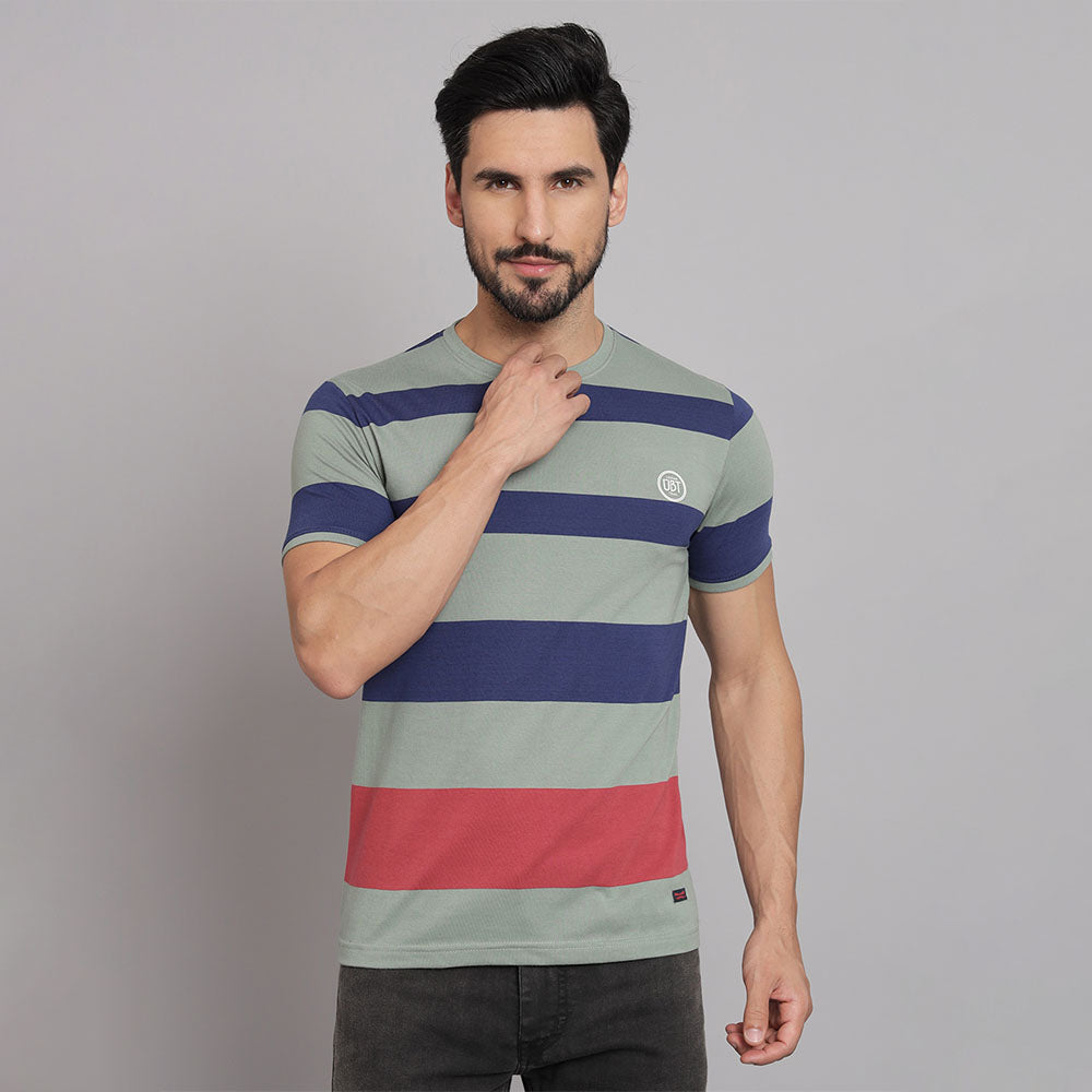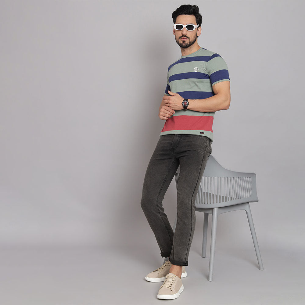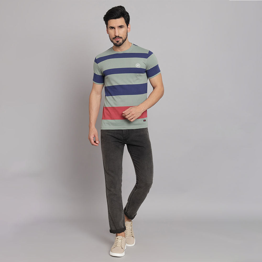 Refresh your wardrobe T-shirts with our Navy Pastel Green Stripers Chinese neck T-shirt. This t-shirt gives utmost comfort during all temperatures. Pair with chinos and shoes for a perfect look.