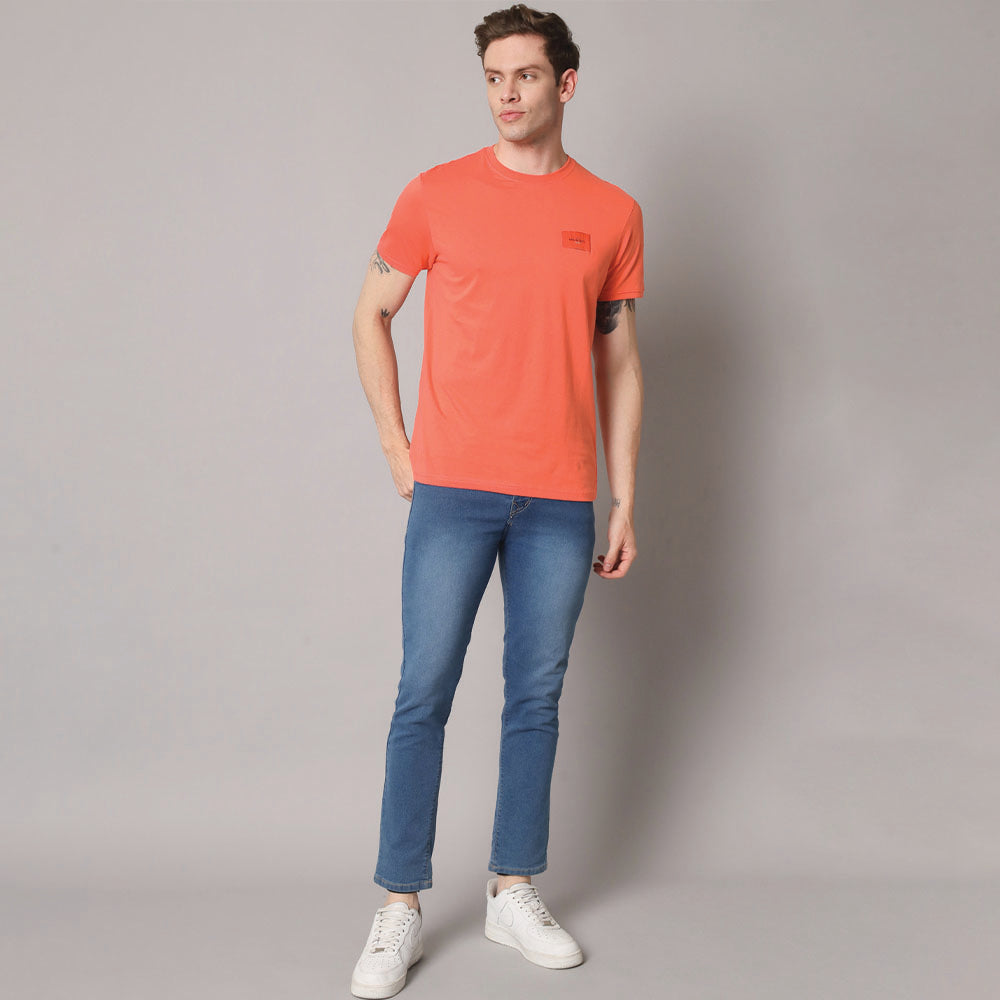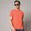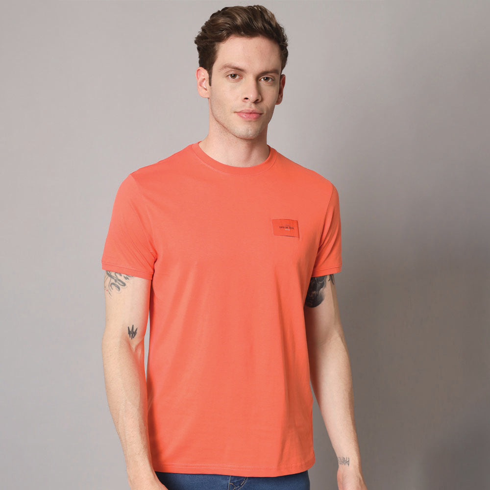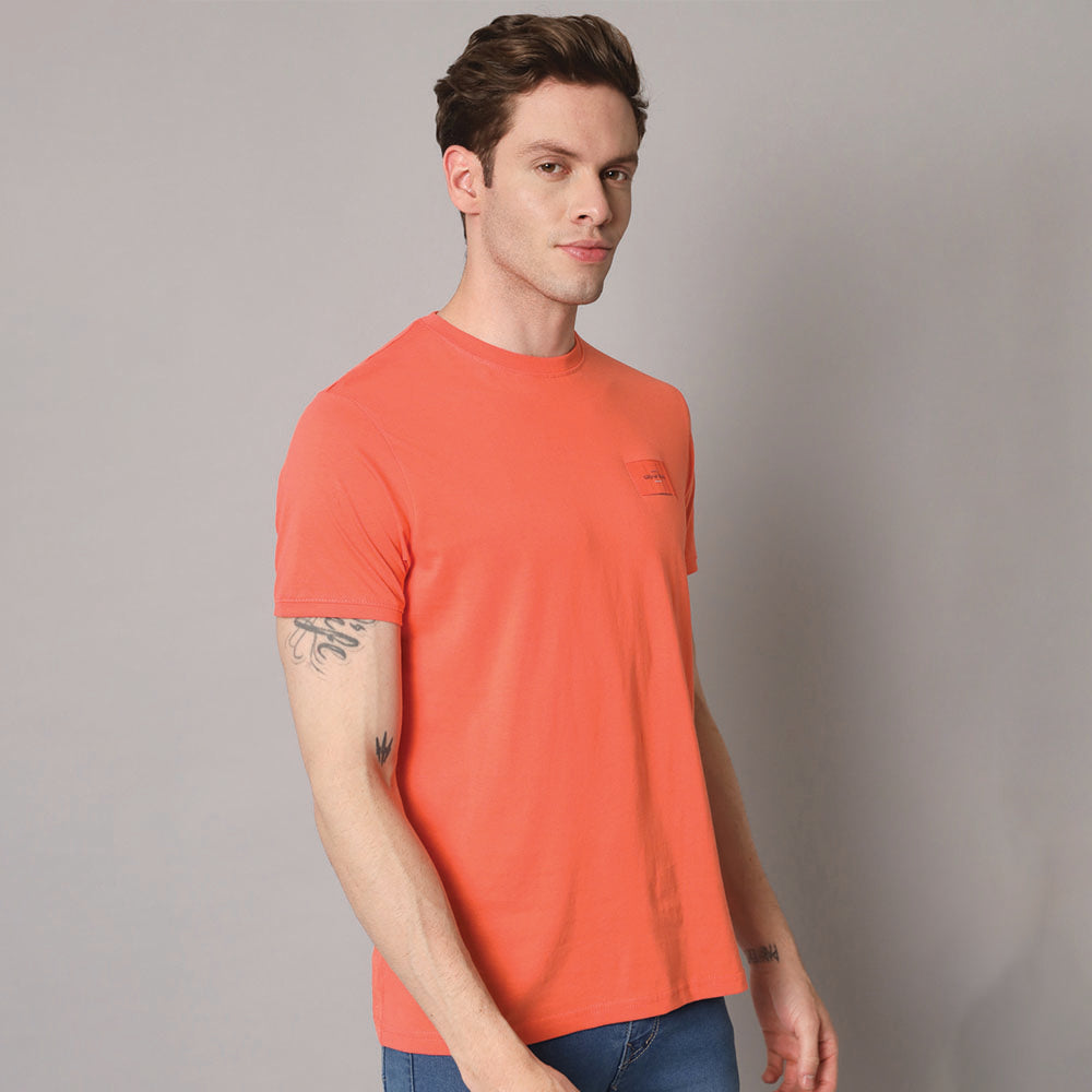 Refresh your casual-wear collection by selecting this classy Vermillion Orange Round Neck T-shirt. Featuring a cool design, this men's T-shirt will match your favorite pair of bottoms. Tailored from breathable cotton, this tee sports a round neck for ultra-comfort.