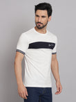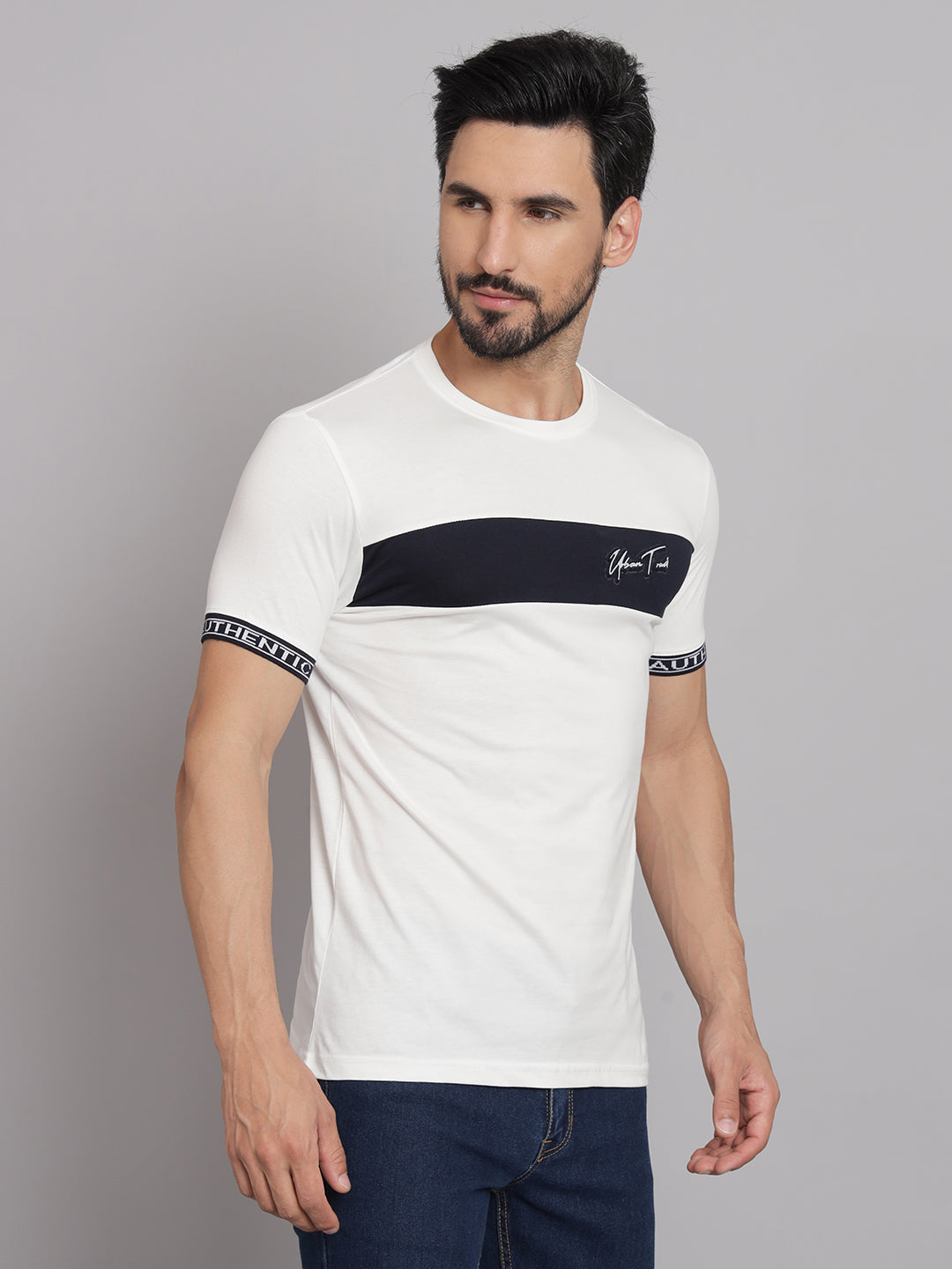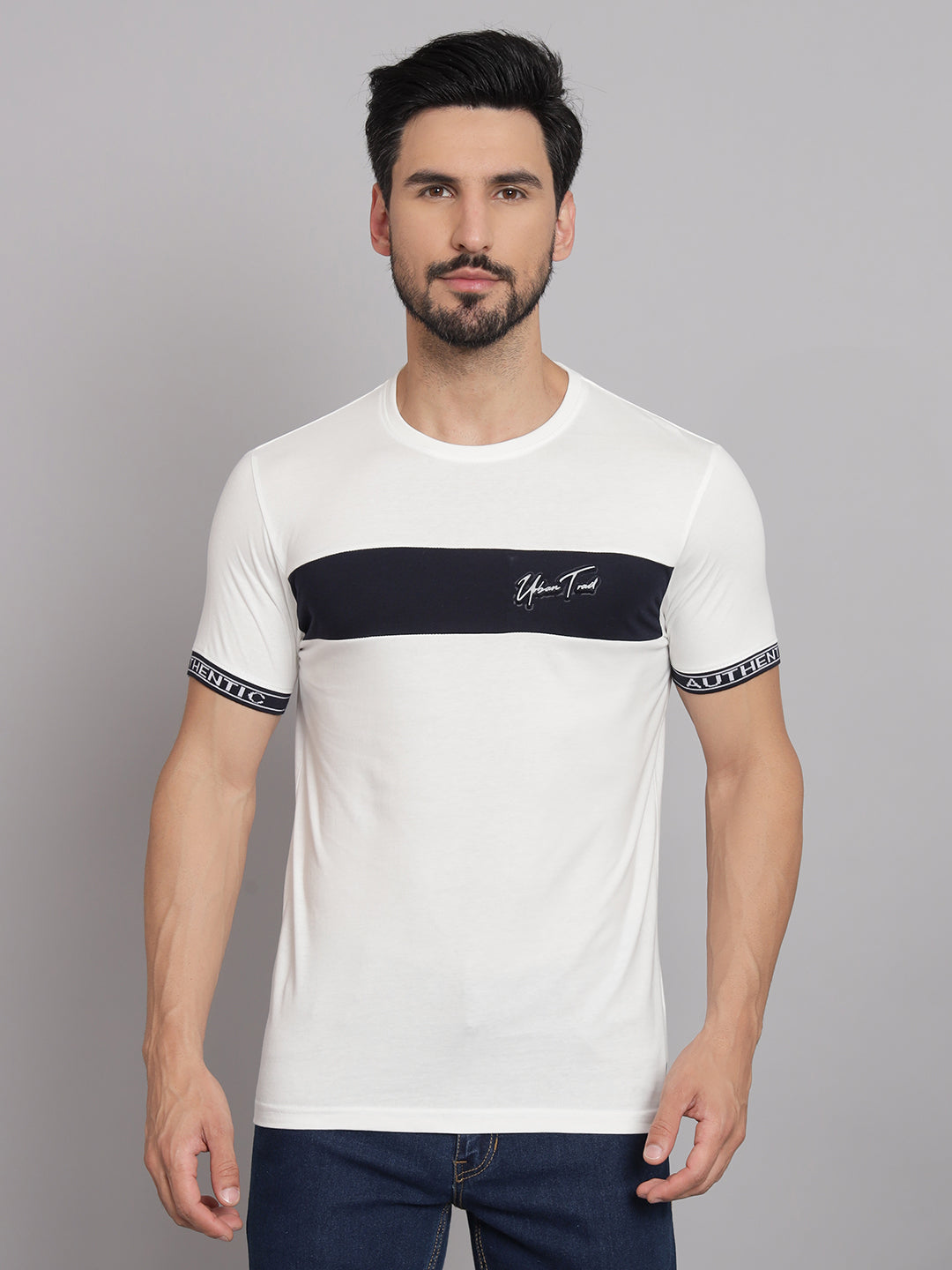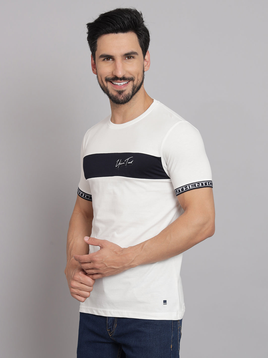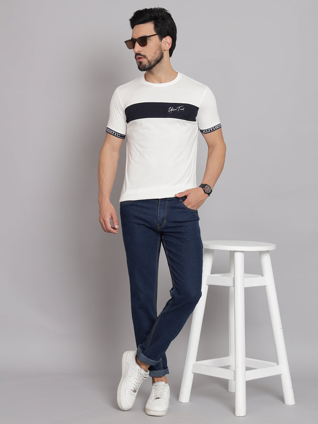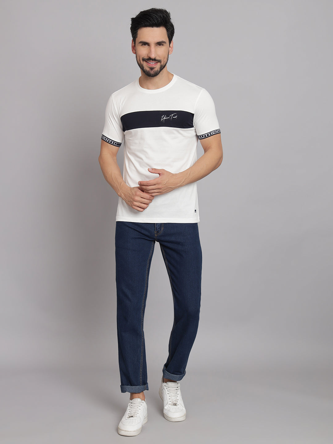 Live in and out in style and comfort as you wear this responsibly crafted white Round-neck t-shirt from our store. Made from premium cotton blend fabric, this t-shirt keeps you clean and fresh all day long. Pair it with dark denim and white casual shoes for a decent and cool look.